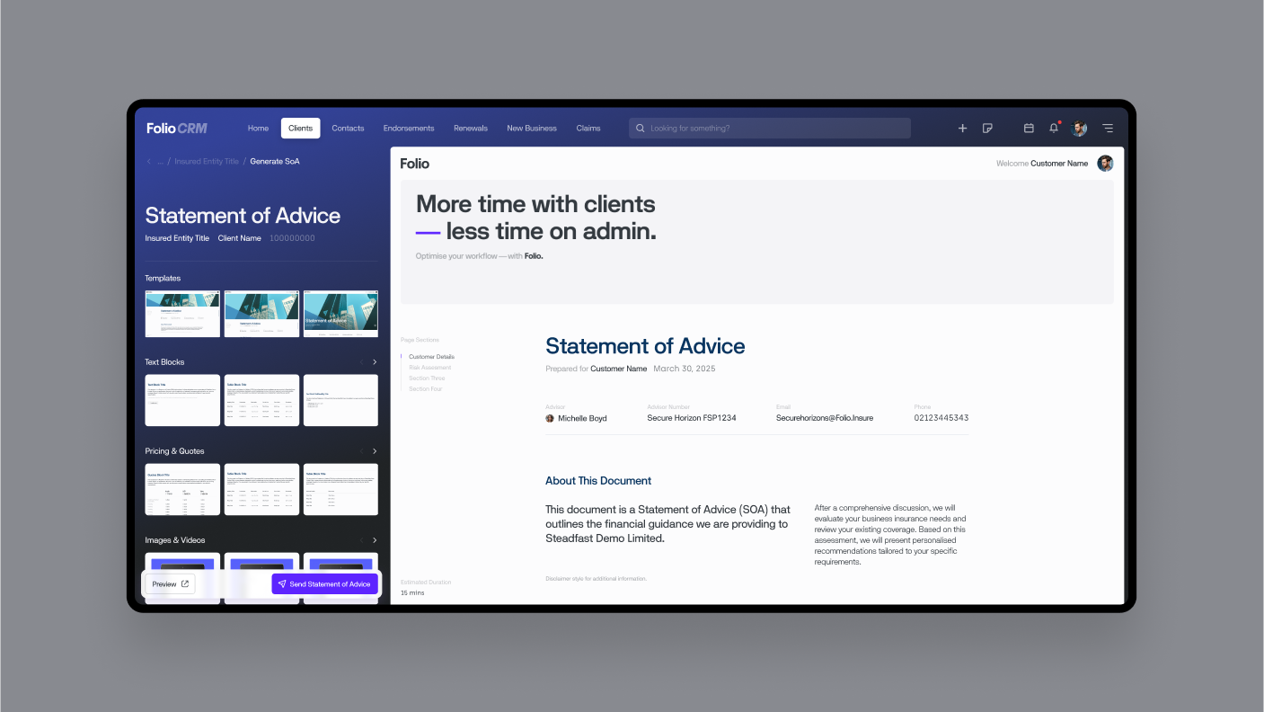 Folio’s automation tools use workflow data to instantly produce Statements of Advice, Schedules, and Invoices. The result is professional, branded documents delivered in seconds — not hours.